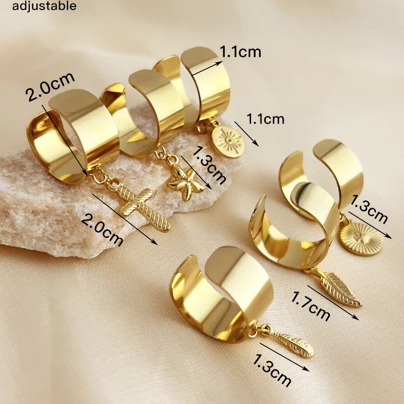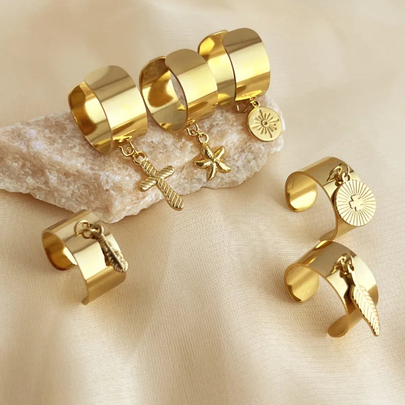 Realce sua personalidade com o Anel Brilho Cosmopolita, uma peça que une o charme do design europeu e americano ao toque contemporâneo do aço inoxidável. Seus pingentes em forma de cruz, estrela e pena, cuidadosamente selecionados, trazem um luxo sutil, perfeito para festas e eventos especiais.